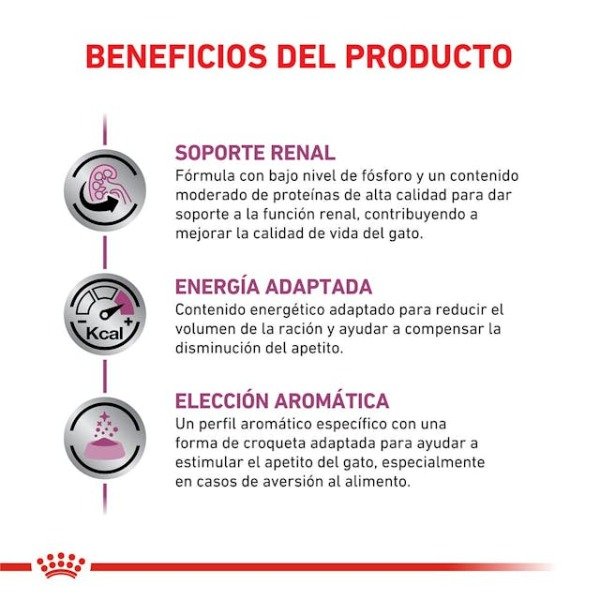 Formulado con bajo contenido de fósforo y un contenido moderado de proteína de alta calidad para dar soporte a la función renal, contribuyendo a mejorar la calidad de vida del gato.